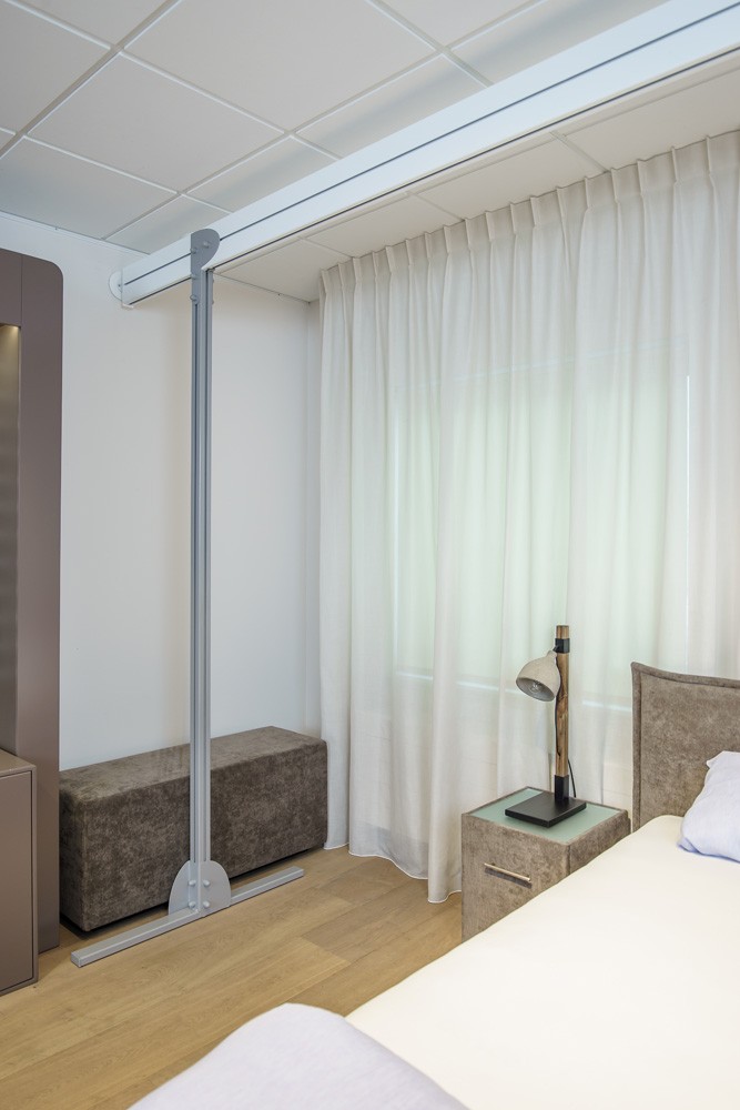Wolnostojący system szynowy jest zalecany, gdy montaż do sufitu lub ścian nie jest możliwy, albo jako rozwiązanie tymczasowe. Nie wymaga wiercenia w ścianach ani w suficie. Istnieje jednak możliwość przymocowania jednego końca szyny do ściany, pozostawiając drugi koniec wolnostojący na bocznej podporze. Solidne i stabilne boczne podpory mają regulowaną wysokość. Długość szyny również można regulować, aby ustawić boczne podpory przy ścianach.