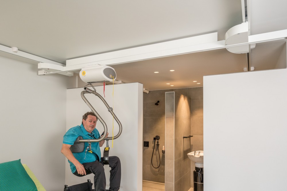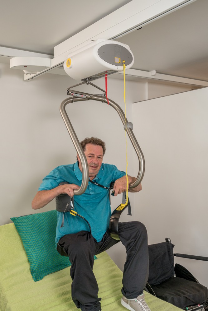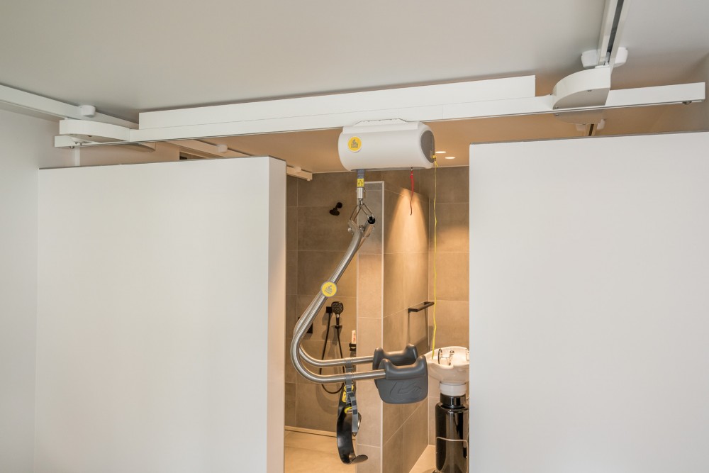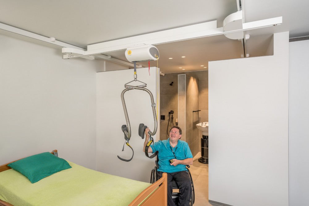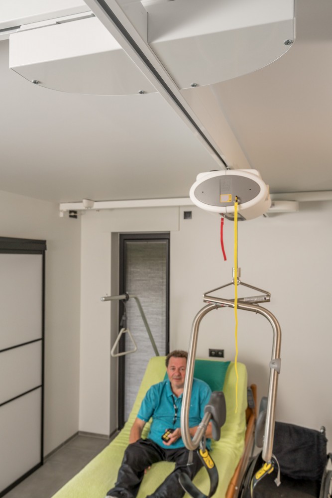 - Szynowy układ trawersowy umożliwia transfer w dowolne miejsce w pomieszczeniu.