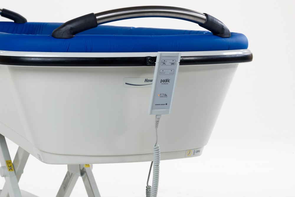 - Rant wózka kąpielowego może być elektrycznie podnoszony i opuszczany, co zapewnia wygodne i komfortowe kąpanie. Przy najwyższej pozycji rantu służy jako płytka wanna.