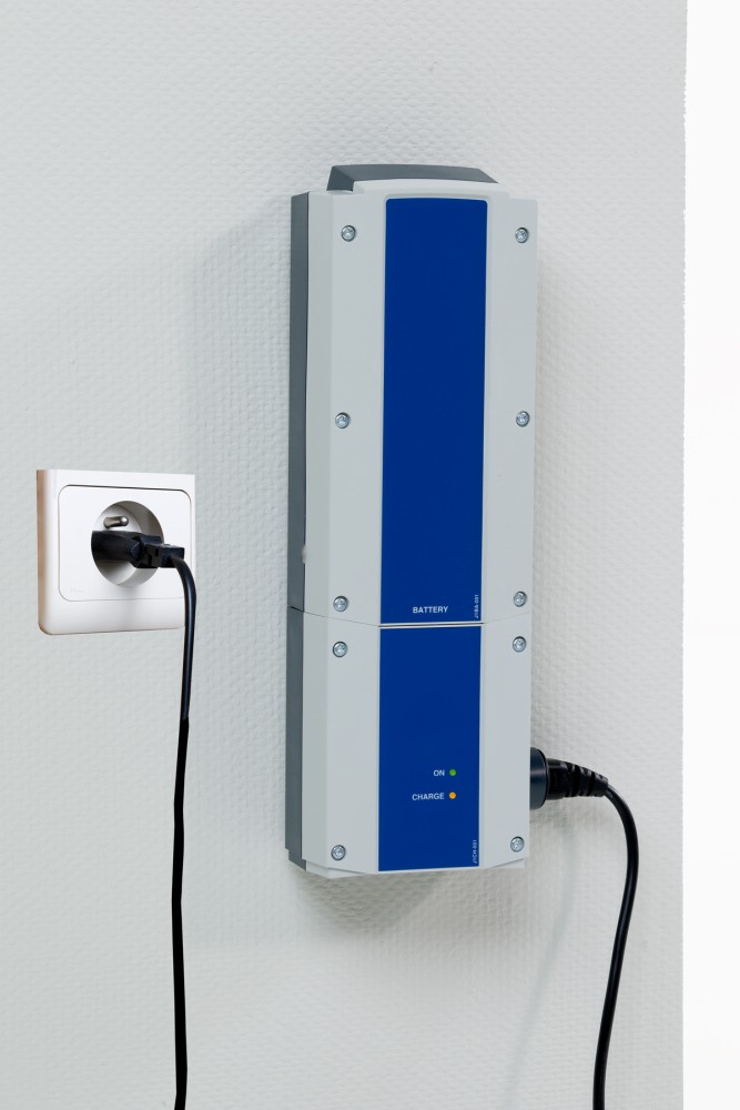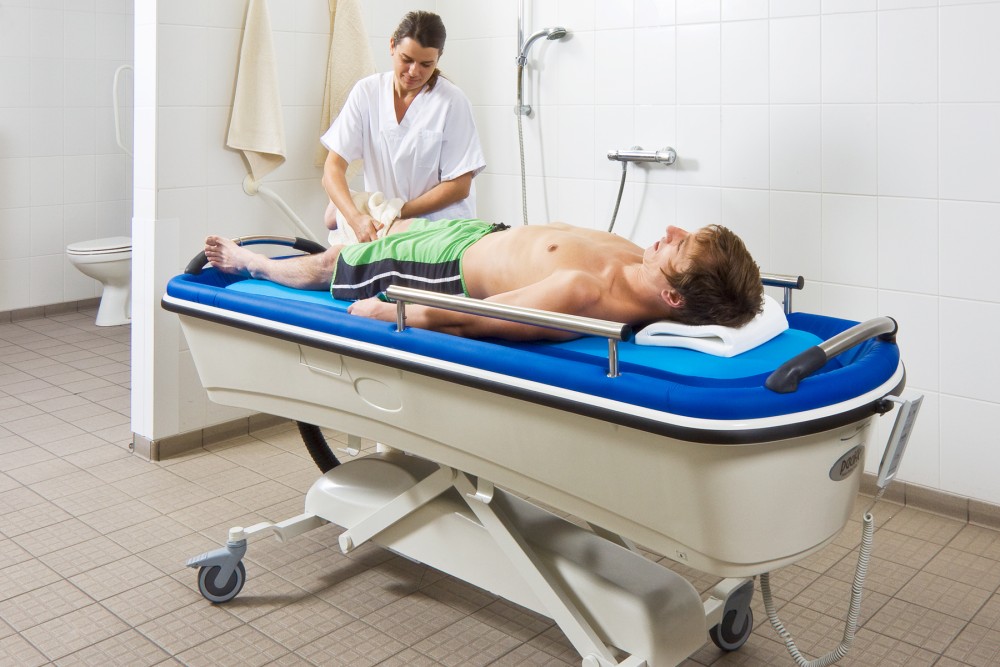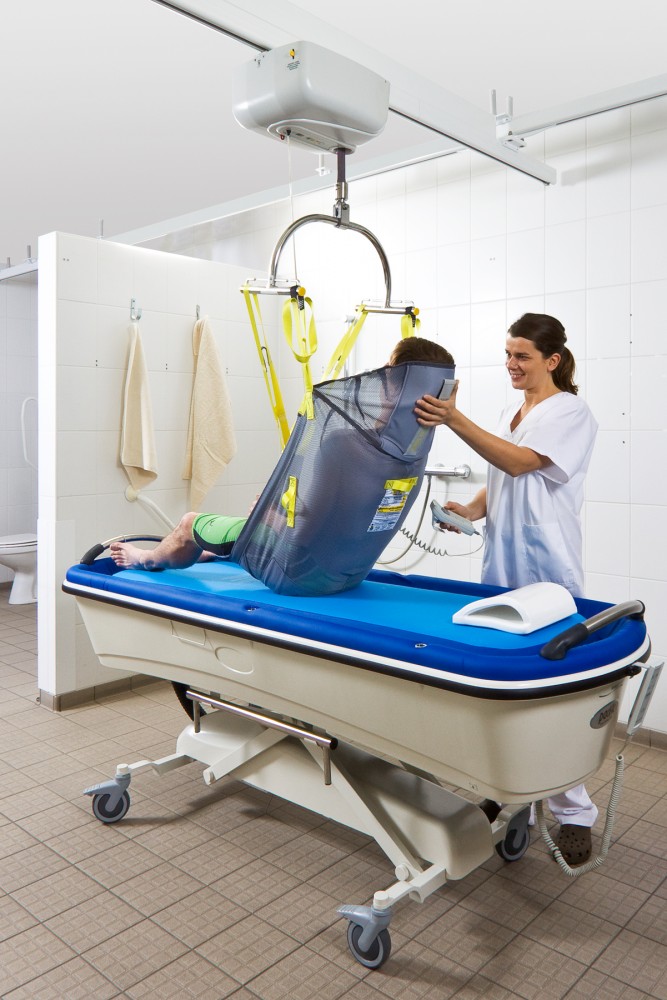 - Cały wózek kąpielowy może być elektrycznie podnoszony lub opuszczany do wysokości wózka inwalidzkiego. Wózek kąpielowy można nawet opuścić do poziomu umożliwiającego samodzielne usadowienie się użytkownika bez pomocy opiekuna.