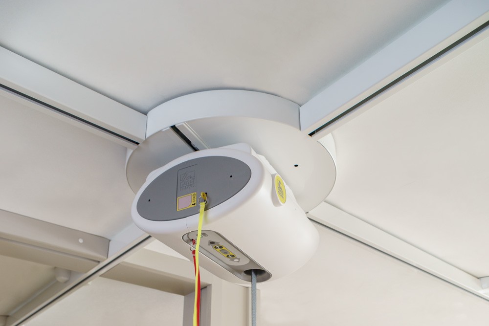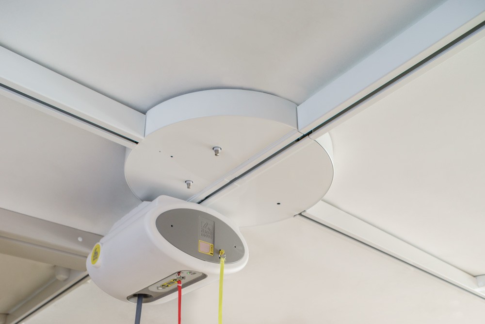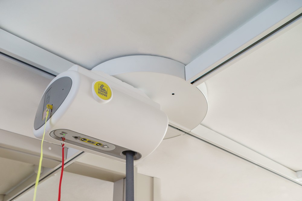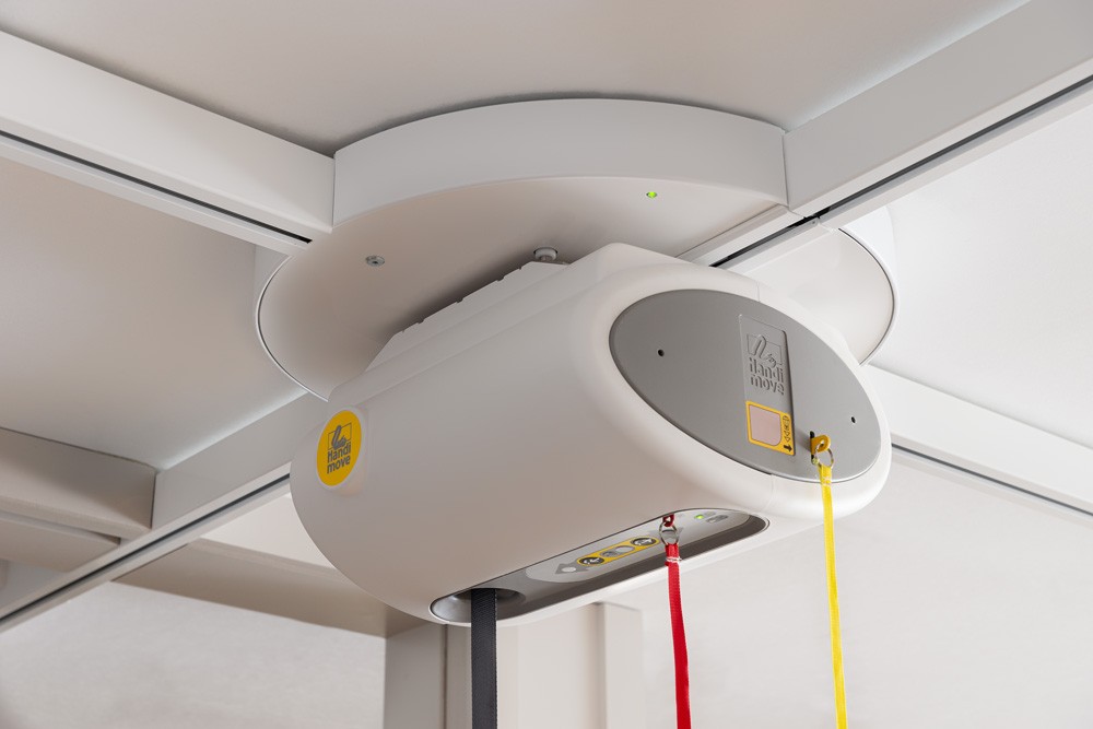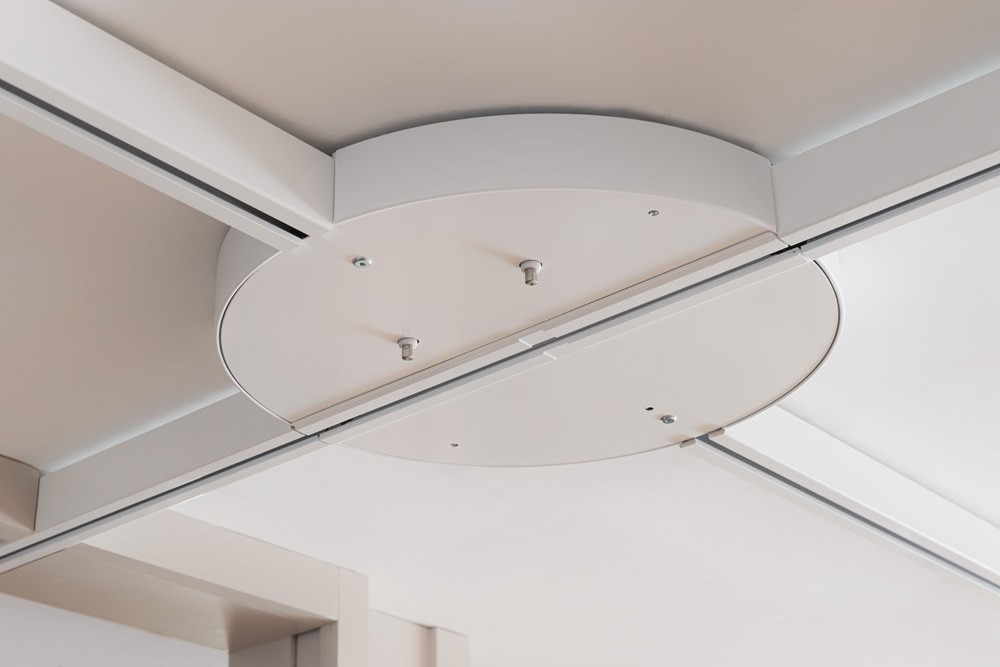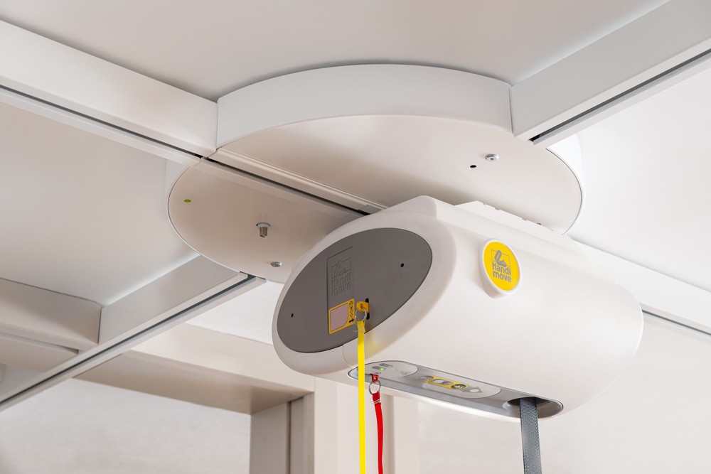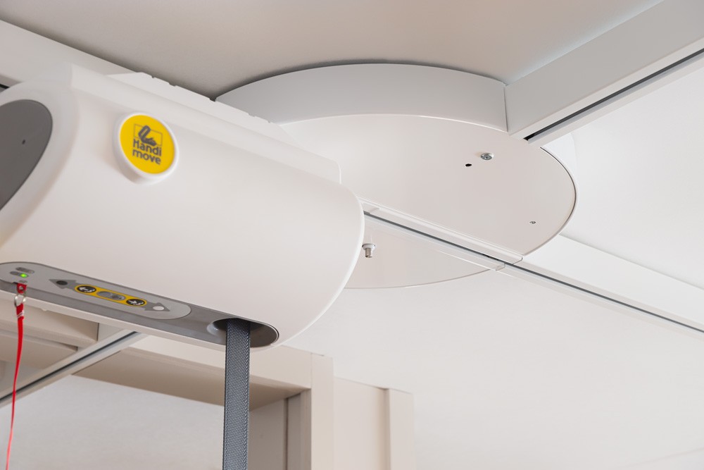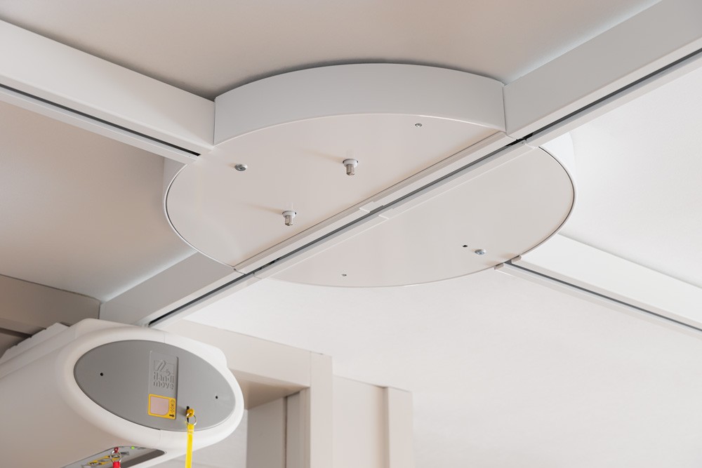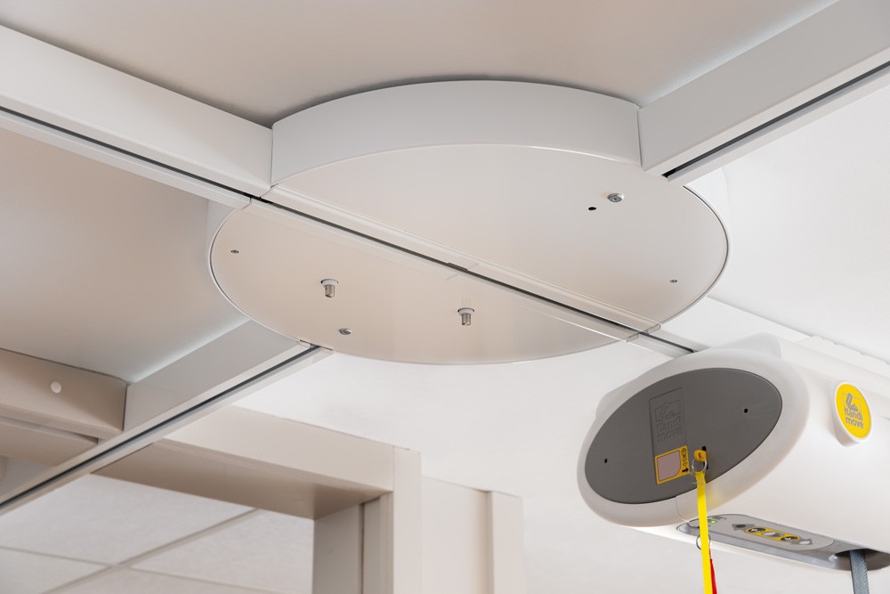 - Zwrotnica obrotowa umożliwia systemowi szyn sufitowych ze stałym podnośnikiem poruszanie się podnośnika w czterech kierunkach. Zapewnia dostęp do kilku pomieszczeń i różnych miejsc transferowych przy użyciu jednego systemu.